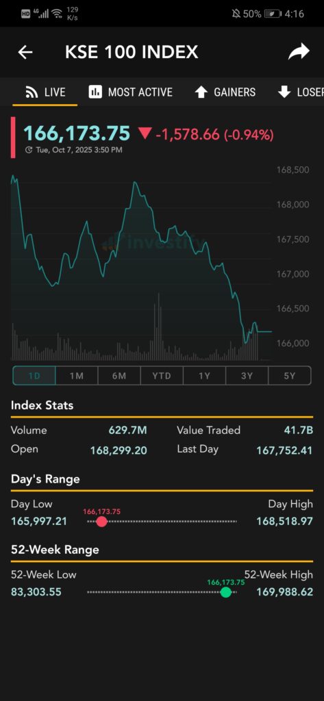 A total of 629.7 million shares were traded, with the overall trade value recorded at Rs. 41.72 billion. The index touched an intraday low of 165,997 and a high of 168,519, reflecting heightened volatility throughout the session.