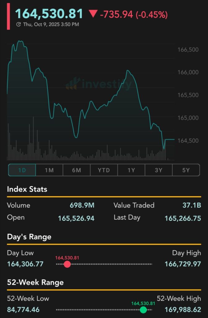 Trading activity remained moderate with a volume of 698.9 million shares and a total value of Rs. 37.08 billion. During the session, the index touched a low of 164,307 and a high of 166,730, reflecting cautious investor sentiment throughout the day.