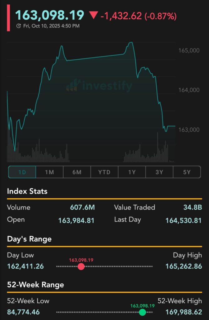 Throughout the session, the index touched an intraday low of 162,411 and a high of 165,263, indicating increased volatility. The decline is largely attributed to profit-taking by investors after recent market rallies and concerns over macroeconomic challenges and policy uncertainties.